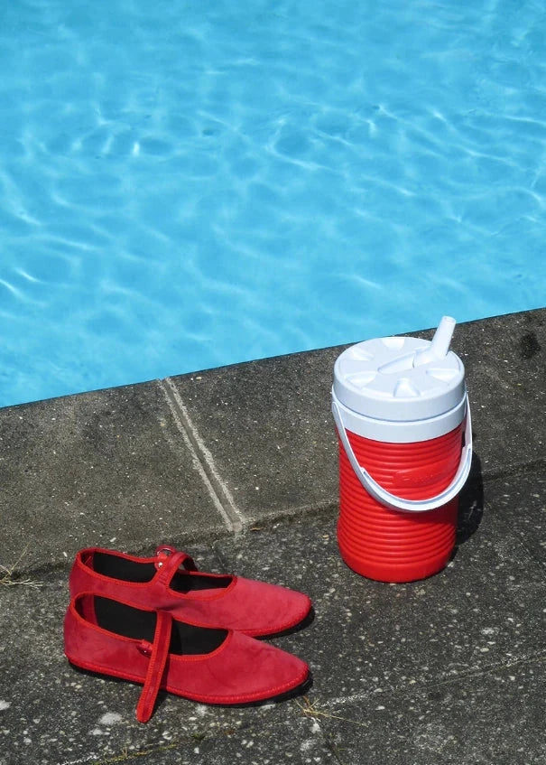 A take on a modern ballerina mixed with the classic features of a Mary Jane. The shoes have a flat sole with a small heel, a buckle closure over the foot, and a closed rounded toe.